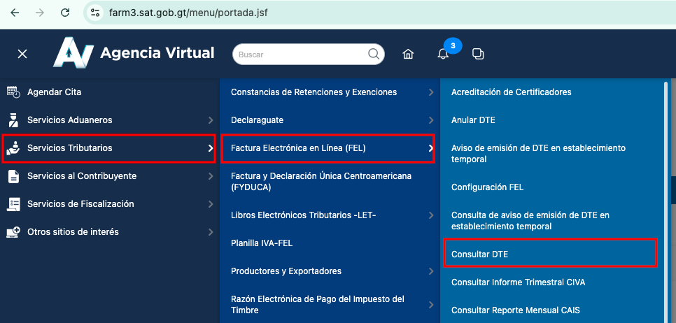 En el menú, selecciona Servicios Tributarios → Fatura Electrónica en Línea (FEL) → Consultar DTE.